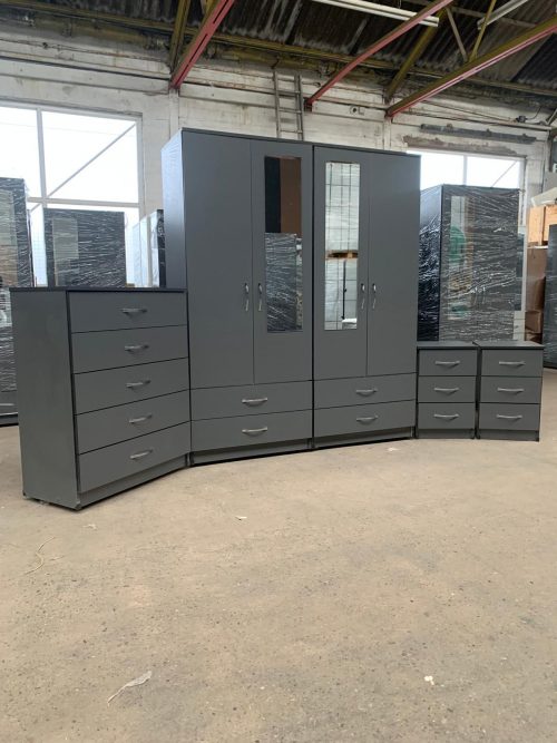 Versatile set of furniture combines style, functionality, and ample storage to enhance your home. The collection includes two spacious wardrobes, a five-drawer chest of drawers, and two bedside tables, each with three drawers. Perfect for bedrooms, living rooms, or any space where storage is essential, this set offers an elegant and practical solution to keep your belongings organized.