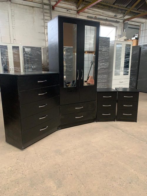 Wardrobe+5 Draw Chester Draw+2xBedside 3 Draw set is a functional and stylish furniture collection designed to provide ample storage while maintaining a sleek, modern aesthetic. The wardrobe features five spacious drawers, offering plenty of room for clothes, linens, and other essentials. The Chester drawers are perfect for storing additional items with a versatile design that fits well in any room. The two bedside tables, each with three drawers, are ideal for keeping your nighttime essentials organized and within easy reach.